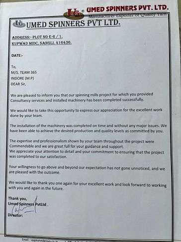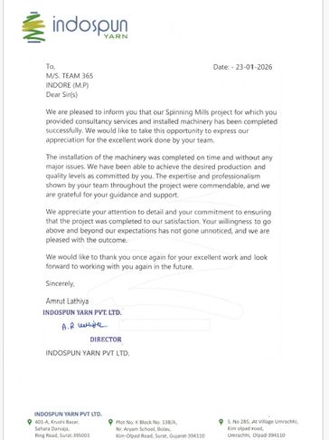 Founded with a mission to provide professional technical services to the textile industry, TEAM 365 emerged in 2005 to fill the gap left by the absence of professional organizations catering to this sector. We take pride in having over 400 satisfied customers both in India and abroad, and throughout our journey, we have set numerous benchmarks in the industry, particularly in turnkey projects.